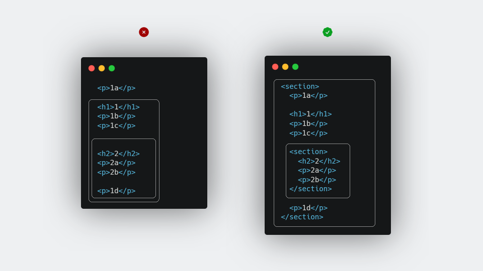 Heading Blocks should have explicit Sections. Explicit sections, unlike implied sections, can cover content that precedes the heading group or those that follows a sub section.